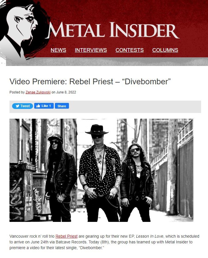 Vancouver’s Rebel Priest is three friends that have been ripping it up through rock n’ roll for years now, across Canada and the world. Their current incarnation is grease-infused trash n’ roll with a penchant for turning it up loud and getting sweaty! They have a new album “Lesson In Love” coming out shortly which will be the fifth under their studded belts. The second single is “Dïvebomber”, a classic sounding tune that the band explains further: