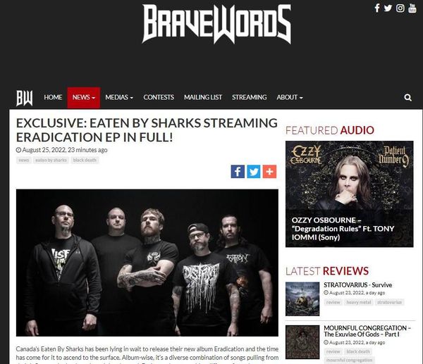 Canada’s Eaten By Sharks has been lying in wait to release their new album “Eradication” and the time has come for it to ascend to the surface. Album-wise, it’s a diverse combination of songs pulling from their influences in death, tech, and thrash metal. Each song has something different from the next one but it stays in line with the metal. The band comments about the record: