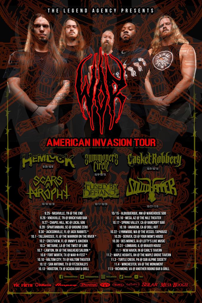 North Carolina, USA groove metal warriors WoR announce they will be hitting the road for the American Invasion Tour w/ Hemlock, Summoner’s Circle, Casket Robbery, Scars Of Atrophy, Fused By Defiance, and Squidhammer. The tour kicks off in Nashville, TN on September 25th and will see the band trek across 18 US states until ending it in Richmond, VA on November 11th. The supporting bands will be playing on selected dates listed below.