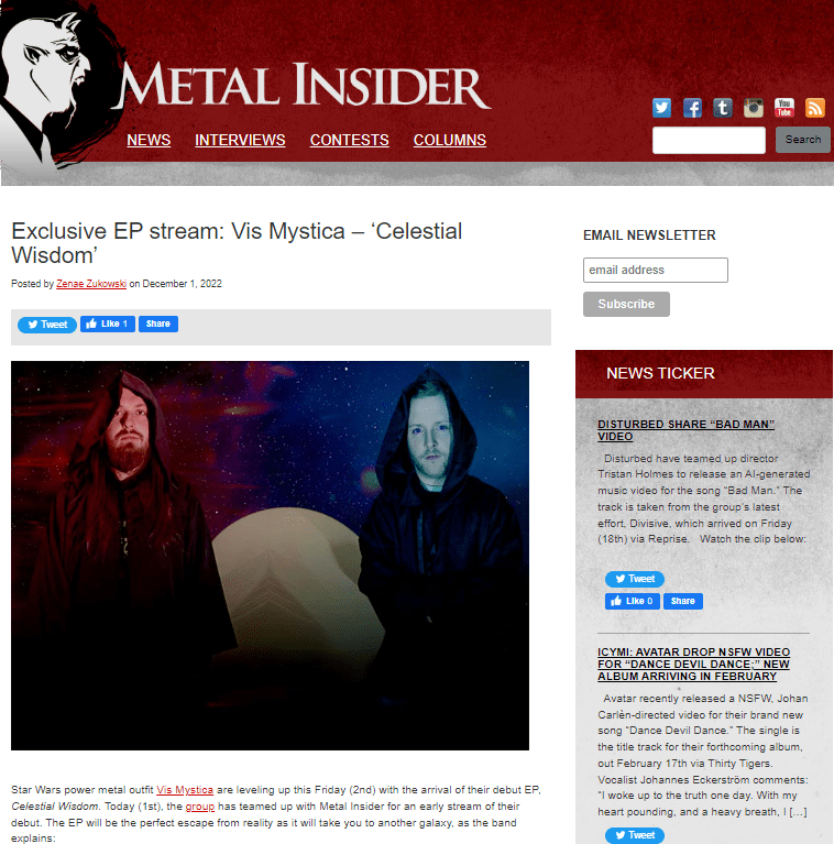 “Vis Mystica is a very interesting power metal band from Pennsylvania. Listening to this group is like finding an oasis in the middle of the driest desert. Although one of its main characteristics is that its music is based on the Star Wars universe, it is fair to say that its music shines by itself and it is not for less, since its influences are not found in its local scene, not even in its country.” – Metal-Rules.com