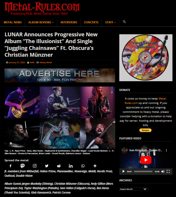 recommended for fans of Opeth, Katatonia, and Haken, The nine-track album “The Illusionist” is being released on March 3, 2023, via Saibot Reign Records and can be pre-ordered via https://lunarbandofficial.bandcamp.com.