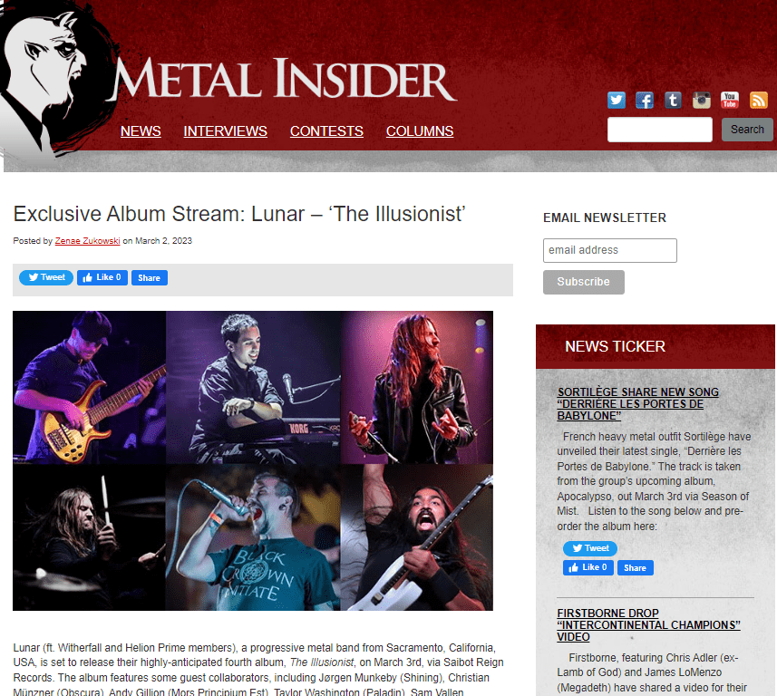 Based out of Sacramento, California, USA, Lunar is a progressive metal band who have released three albums thus far, with their fourth out on March 3rd. Chock-full of epic riffs and technical details, Lunar’s “The Illusionist” featuring album guests Jørgen Munkeby (Shining), Christian Münzner (Obscura), Andy Gillion (Mors Principium Est), Taylor Washington (Paladin), Sam Vallen (Caligula’s Horse), Ben Karas (Thank You Scientist), Gleb Kanasevich, and Patrick Corona is a magical concept album that pairs creative metaphors with relatable life occurrences. According to the band, this is the best album they’ve done so far and they anticipate it to be the fan favorite. Each song sounds different from the rest, but together they are cohesive listening from front to back. The band continues to explain: