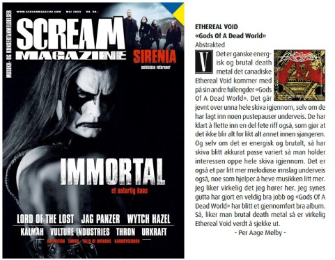 “The music pounds through your skull, marching forward with groove in every song. Each song has some kind of hook that draws you in. It’s never the same, though, and never the coming from just one aspect of the song. Ethereal Void really knows how to craft a song to grab your attention and keep it. Overall, Gods of a Dead World is a cohesive album with plenty to offer fans of almost any genre touching death metal. If you are looking a new album to please the old gods, give this one a spin for sure.” – Metal Purgatory