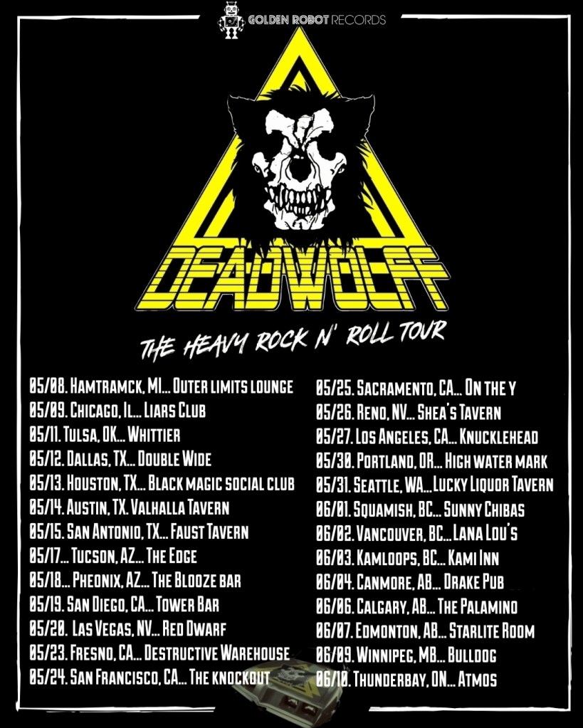 A blend of hard rock, punk, and metal, Deadwolff set themselves apart from other bands with their take on the New Wave of Heavy Rock and Roll. Recommended for fans of Judas Priest, Motorhead, and W.A.S.P, Deadwolff‘s is a revival of foot-tapping, beer-drinking, headbanging tunes, and more. The band has updated their upcoming tour dates across the United States and Canada this May and June in support of their debut full-length “Heavy Rock N’ Roll” released on March 31st via Golden Robot Records.