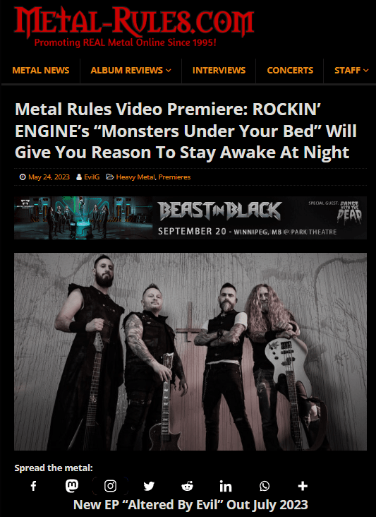 Pedal to the floor, motor running high! That’s how Ottawa, Canada’s Rockin’ Engine rolls – full throttle, no compromise. Officially formed in 2018, they released their first self-produced album “Midnight Road Rage”, which caught the attention of many hard rock and heavy metal enthusiasts throughout Europe and America. Switching things into high gear for 2023, Rockin’ Engine produced their very anticipated new EP “Altered By Evil” inspired by 80’s psycho horror, ready to be released this summer. Each track is chock full of high-octane riffs, thunderous drums, and catchy vocals that deliver chilling lyrics with power and finesse. The first single accompanied by a high-production video is “Monsters Under Your Bed”, which tells the story of a woman haunted by her past. The band comments:
