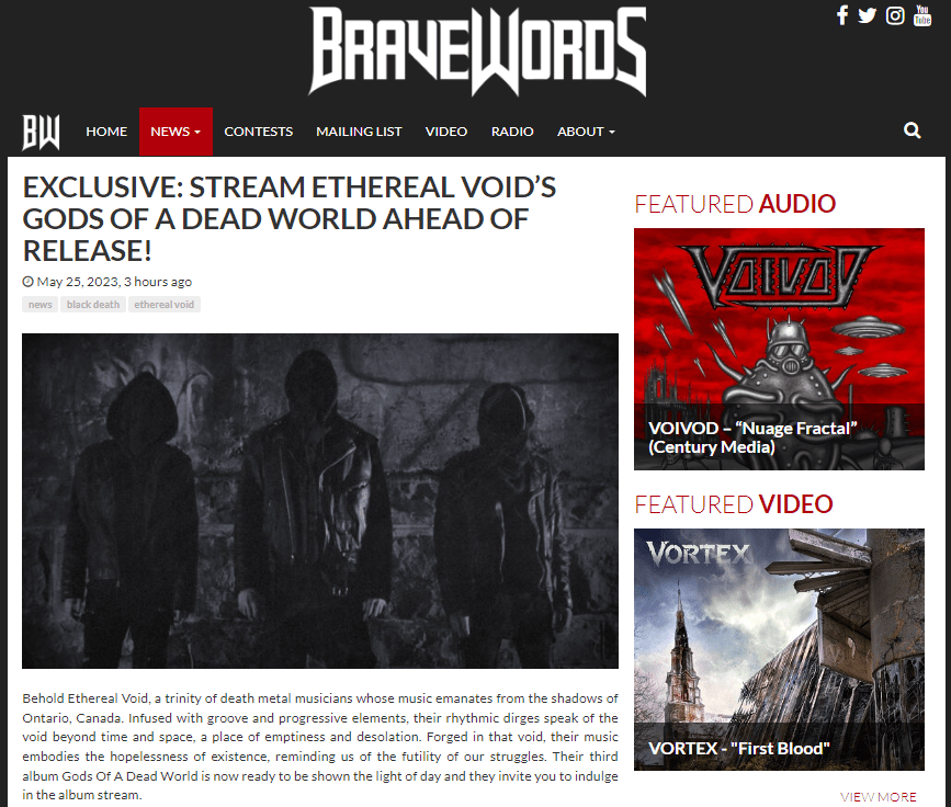 Behold Ethereal Void, a trinity of death metal musicians whose music emanates from the shadows of Ontario, Canada. Infused with groove and progressive elements, their rhythmic dirges speak of the void beyond time and space, a place of emptiness and desolation. Forged in that void, their music embodies the hopelessness of existence, reminding us of the futility of our struggles. Their third album “Gods of a Dead World” is now ready to be shown the light of day and they invite you to indulge in the album stream. They comment: