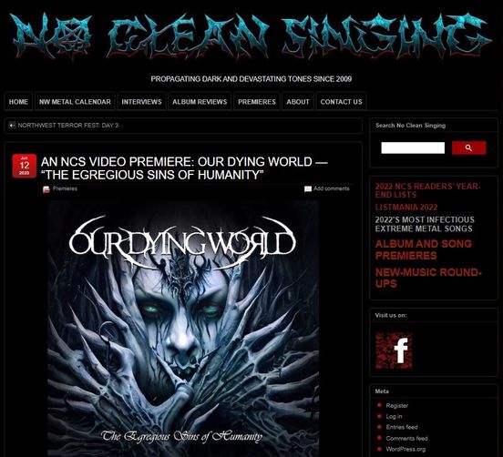 “We’ll make you a solemn promise: Whatever condition you happen to be in now (unless you’re in a coma), the song and video we’re about to present will make you feel orders of magnitude more alive, accelerating your heart-rate, igniting your fast-twitch muscles, and spinning your head like a glorious top. And for those of you who want your music to attack like a pack of rabid dogs, it fills that need, too. The song is “Veil of the Reaper“, and it comes from Hymns Of Blinding Darkness, the forthcoming album by the Los Angeles band Our Dying World. The new album marks a significant departure from the music on their debut, Expedition, moving in directions that may spawn memories of such bands as Children Of Bodom, Nightwish, and Dimmu Borgir, and you’ll get a vivid understanding of that when you hear “Veil of the Reaper“.” – No Clean Singing