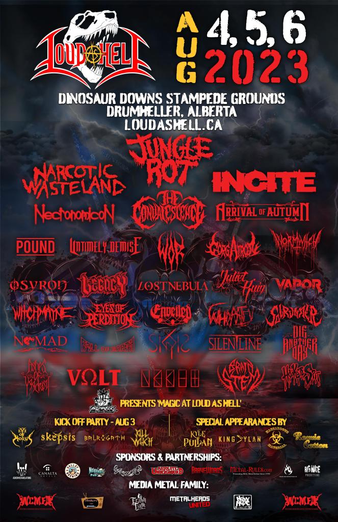 Alberta, Canada’s LOUD AS HELL has a stacked lineup for its 2023 edition and their festival Spotify playlist will give your eardrums a nice blast of heavy to get you ready for the pit with JUNGLE ROT, NARCOTIC WASTELAND, INCITE, NECRONOMICON, THE CONVALESCENCE, ARRIVAL OF AUTUMN and lots more (full lineup listed below).