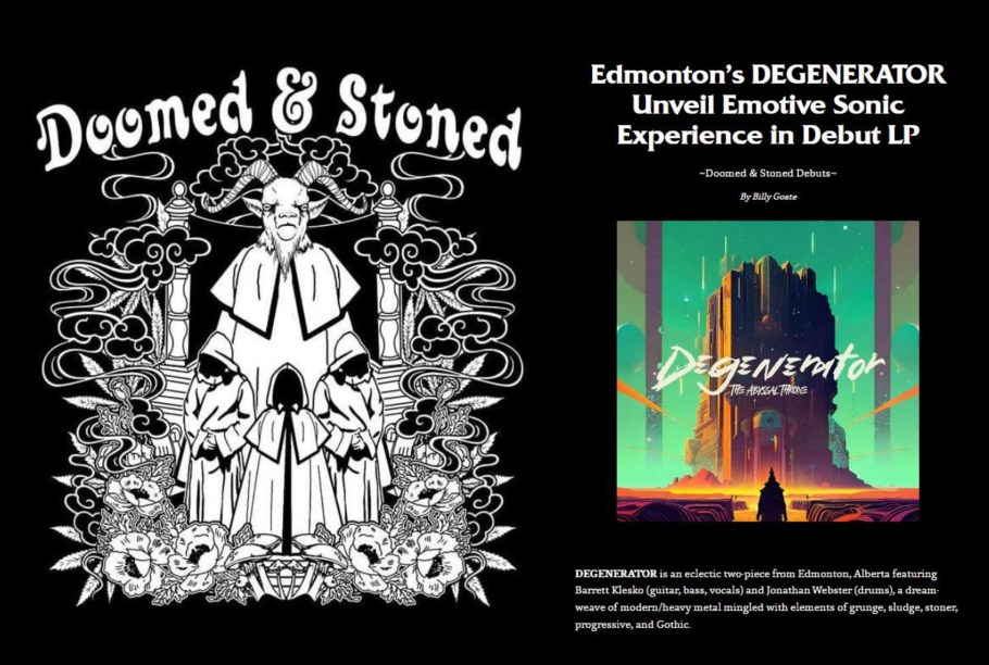 Degenerator, Edmonton, Canada’s aggressive sonic titans, unleash a captivating blend of stoner, sludge, grunge, and goth rock with their debut album “The Abyssal Throne”, which is streaming now. Led by Barrett Klesko (Alle Else Fails) who is joined by Jonathan Webster (Pass of Era, ex-Striker), this relentless musical force delivers a spellbinding sound that resonates with fans of grunge, sludge, stoner, and doom metal. These internationally acclaimed musicians set the stage for an immersive journey through explosive moods, progressive time signatures, and hauntingly unusual vocal melodies. Klesko comments on what’s in store for those who check the album: