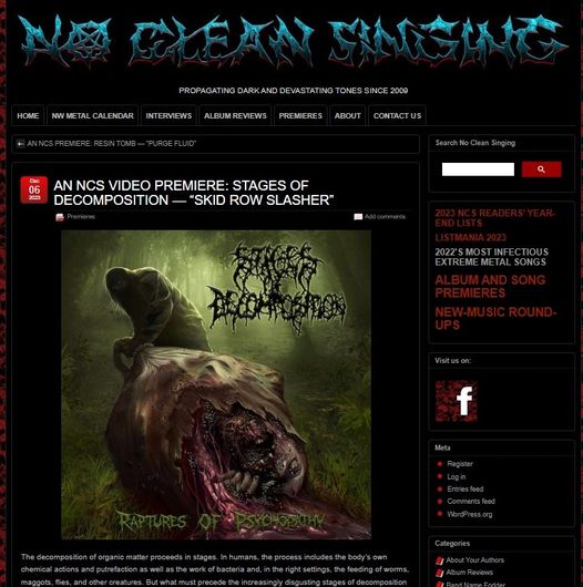 “This is pure bang your head ‘till it pulps music. From growling guitars to smash the kit into pieces drumming, then snarling vocals, and a horror tinge (as we’ll see). It’s only right that they’re signed to Gorehouse Productions… Stages of Decomposition are tight, they can be felt as well as heard. The album (Piles of Rotting Flesh) is consistent with no weak moments. You will bleed, this will hurt. For proof check the official video below.” – Severed-Cinema