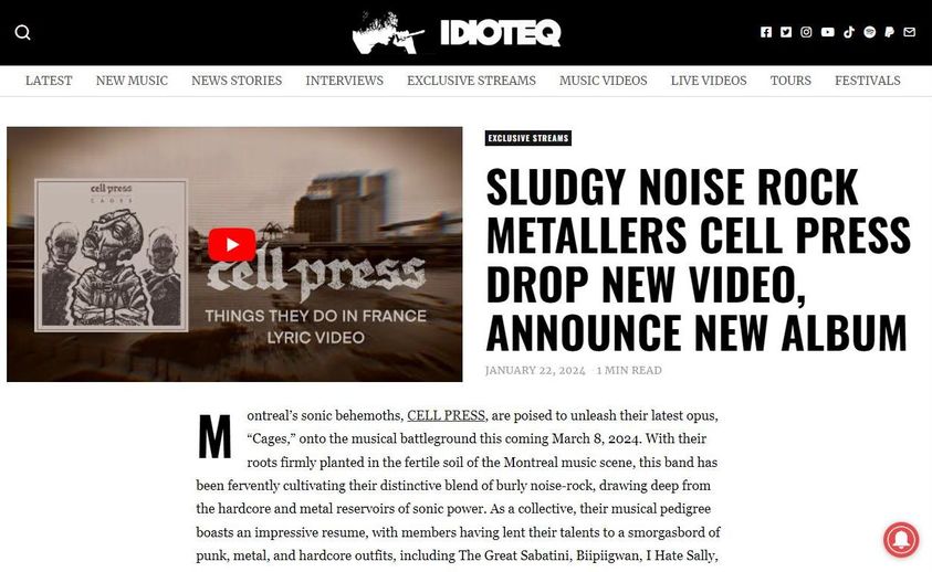 Cell Press is a Montreal-based band that formed in 2019. They play a sort of burly noise-rock that leans more on the hardcore and metal side of the swamp. Members have played in a myriad of punk, metal, and hardcore bands such as The Great Sabatini, Biipiigwan, I Hate Sally, The Chariot, Animal Ethics, Architect, Swarm Of Spheres, and Angles. They are releasing their first full-length album “Cages” this March and are now introducing it with the single “Things They Do In France”, a song about lost love and what could have been had it not been so toxic. The band shares more info: