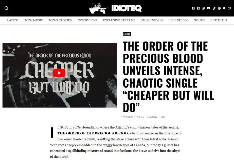 The Order of The Precious Blood, the blackened hardcore punk band hailing from St John’s Newfoundland, Canada, has two chaotic singles coming out this spring, in rapid succession. The first, “Cheaper But Will Do”, is a relentless two-minute journey that blurs the line between metal and hardcore punk. The single immerses listeners in a whirlwind of chaotic emotions, rapidly transitioning through sections while maintaining an intense and abrasive sound. Vocalist Paul Brake comments on the succinct single: