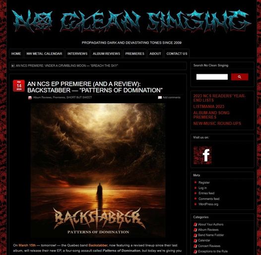 “Patterns of Domination” was produced by Backstabber vocalist/guitarist Christian M. Thériault and mixed and mastered by Christian Donaldson (Cryptopsy) and can be heard via its full stream premiere on NoCleanSinging HERE.