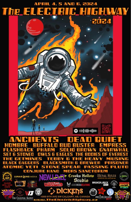 The Electric Highway Festival returns April 4th to 6th in Calgary, AB at Dickens (1000 9 Ave SW) for its 2024 edition with Canadian Juno Award-winning Vancouver band Anciients headlining the festival. They will be joined by various Western Canadian bands including Dead Quiet, Empress, Flashback, Buffalo Bud Buster, Hombre, and Set & Stoned along with festival newcomers Prisoner, Passing Pluto, Mors Sanctorum, Gnarwhal, Black Daggers, and more! This is the biggest festival lineup yet with 23 bands over 3 days.