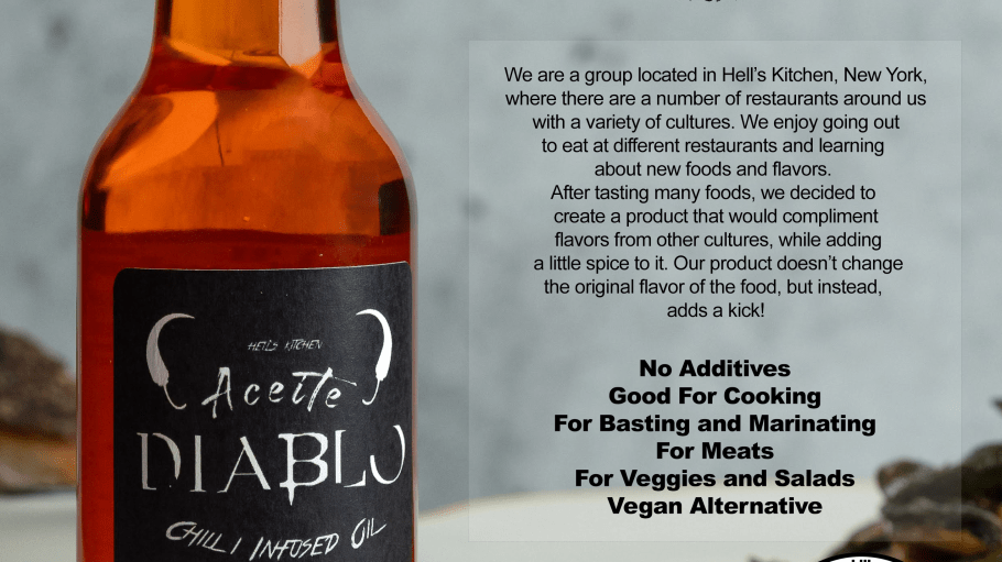 “I’m located in Hell’s Kitchen, New York, where there are a large number of restaurants around with a variety of cultures. My family and I enjoy going out to eat at different restaurants and learning about new foods and flavors. After tasting many foods, we decided to create a product that would complement flavors from other cultures, while adding a little spice to it. Our product doesn’t change the original flavor of the food, but instead, adds a kick!”