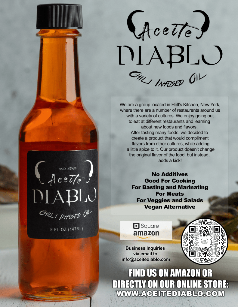 Aceite Diablo is the culmination of a long journey that started more than a year and a half ago for Pirosaint drummer Ignacio Orellana. Its products are a blend of devilish spices turned into a sinfully delicious oil created in Hell’s Kitchen, NY.