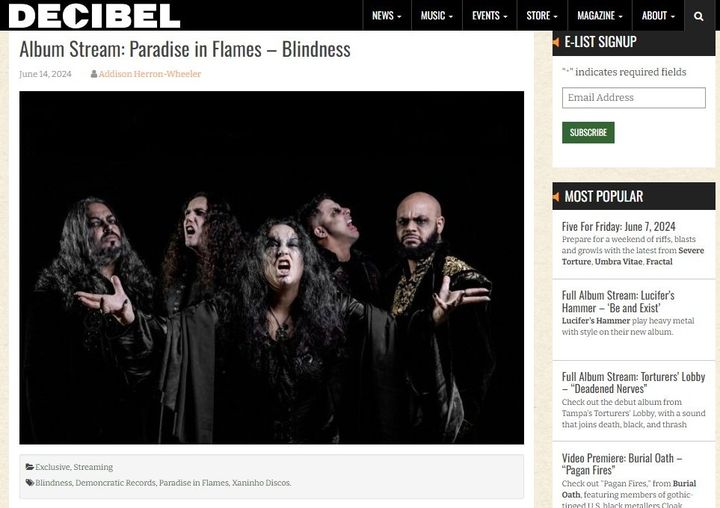 Since 2003, Brazil’s Paradise In Flames has been shattering boundaries and spreading its identity-filled sound infused with blazing notes of pure hatred to audiences far and wide. Their latest concept album “Blindness” is out on June 14th with its full stream premiere being presented now on Decibel Magazine HERE.