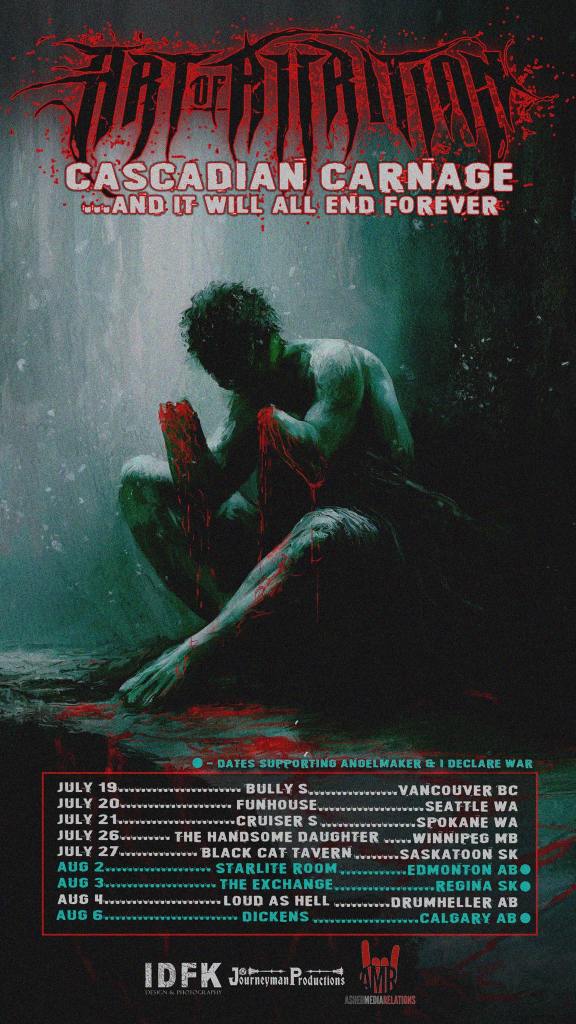 Launching their pre-order for the new EP “…And It Will All End Forever” dropping on July 26th (links listed below), Red Deer, AB’s Art of Attrition announces they will be hitting the road this July and August for “The Cascadian Carnage Tour”, which includes a performance at Loud As Hell Festival in Drumheller, AB along with select support dates with Vancouver’s AngelMaker and Seattle’s I Declare War.