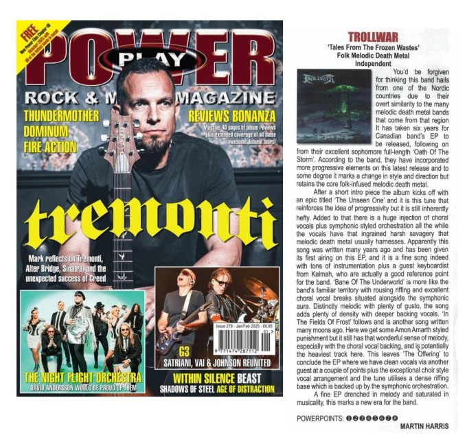 “Quebec symphonic, melodic heroes Trollwar drop their next EP, Tales from the Frozen Wastes, on November 15… The record fuses the band’s roots with even more symphonic orchestration, progressive elements, and all-around big sounds. As always, the lyrics are also a big part of the journey, transporting you through to a fantastical realm.” – Decibel Magazine