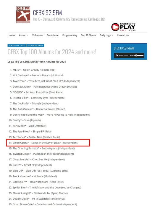 92.5 FM CFBX “the X” – Top 25 Loud/ Metal / Punk Albums for 2024 #14 Blood Opera Inc. January 24, 2025 by Asher · Blood Opera · radio charts CFBX Top 100 Albums for 2024 and more! Share this:TweetShare on Tumblr Click to share on Reddit (Opens in new window) Reddit More Click to share on Blogger (Opens in new window) Blogger Like Loading... Related « Prev Next » Leave A Comment ↓ Comments Leave a comment Cancel reply Δ Trackbacks & Pingbacks No incoming links found yet.