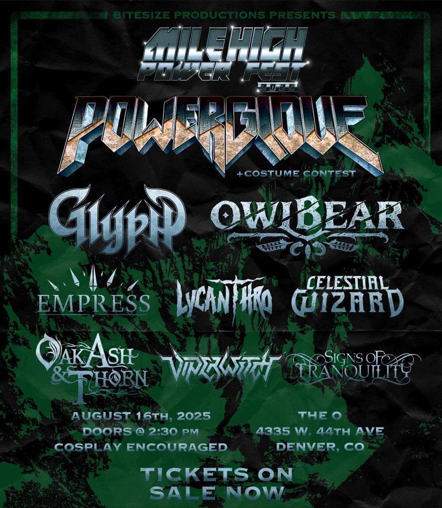 Featuring POWERGLOVE, GLYPH, OWLBEAR, EMPRESS, LYCANTHRO, CELESTIAL WIZARD and more! The 2nd edition of Mile High Power Fest being hosted on August 16th at the Oriental Theater (4335 W 44th Ave) in Denver, CO will be a celebration of strength, unity, and the unyielding spirit of metal.
