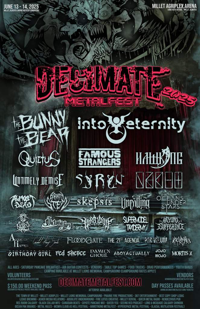 DMF returns to the Millet Agriplex Arena in Millet, Alberta, on June 13th and 14th, 2025, for another electrifying weekend of heavy metal music and community spirit. As one of Western Canada’s premier metal festivals, Decimate Metalfest continues to deliver unforgettable experiences for metal enthusiasts of all kinds!