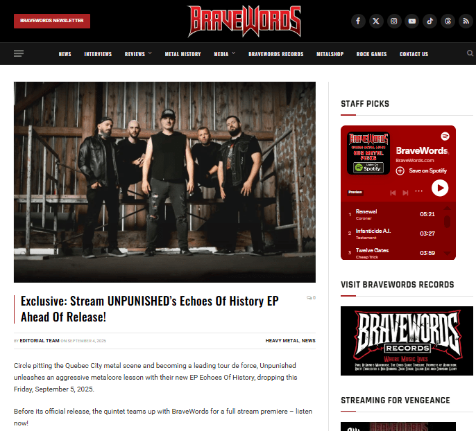 Circle pitting the Quebec City metal scene and becoming a leading tour de force, Unpunished unleashes an aggressive metalcore lesson with their new EP “Echoes of History,” dropping this Friday, September 5th, 2025. Before its official release, the quintet has teamed up with Bravewords for a full stream premiere HERE.