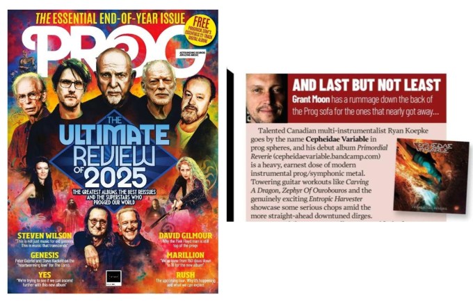 “Talented Canadian multi-instrumentalist Ryan Koepke goes by the name Cepheidae Variable in prog spheres, and his debut album Primordial Reverie is a heavy, earnest dose of modern instrumental prog/symphonic metal. Towering guitar workouts like Carving A Dragon, Zephyr Of Ourobouros and the genuinely exciting Entropic Harvester showcase some serious chops amid the more straight-ahead downtuned dirges.” – Prog Mag