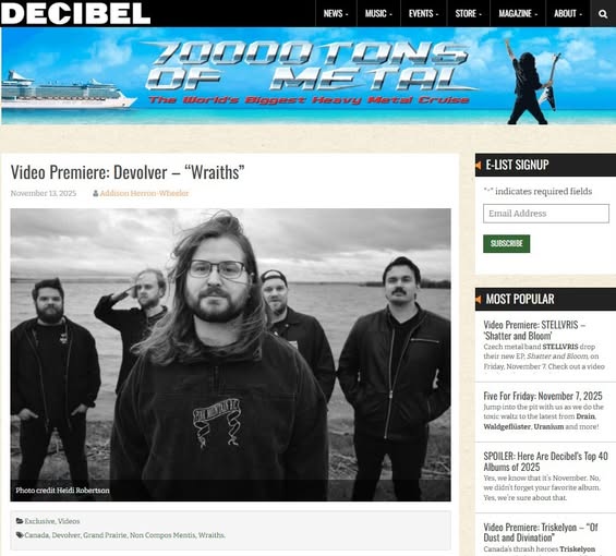 Grande Prairie, Canada’s own metal force, Devolver, has dropped a powerful new music video for “Wraiths,” a standout track from their latest album “Non Compos Mentis.” Filmed during an intimate album release show at Grain Bin Brewing, the video captures the raw energy and camaraderie of a night that brought 150 fans together under the Alberta sky, immortalizing a night of celebration, community, and crushing riffs.