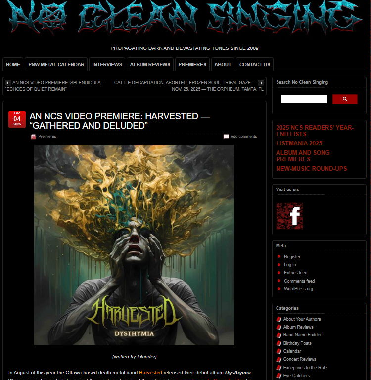 “Your muscles are about to reflexively twitch, your head is about to hammer, your pulse is about to accelerate. Audio worms will slither into your ear canals and take up residence there. Some of your cranial neurons may start spinning, creating visions of fast devils and hulking monsters. Those are our predictions of what will happen when you see and hear the playthrough video we’re premiering for the song “Synaptic Confusion” by the Ottawa-based death metal band Harvested. It’s an excellent way to rev up your own motor as Harvested rev up theirs.” – No Clean Singing