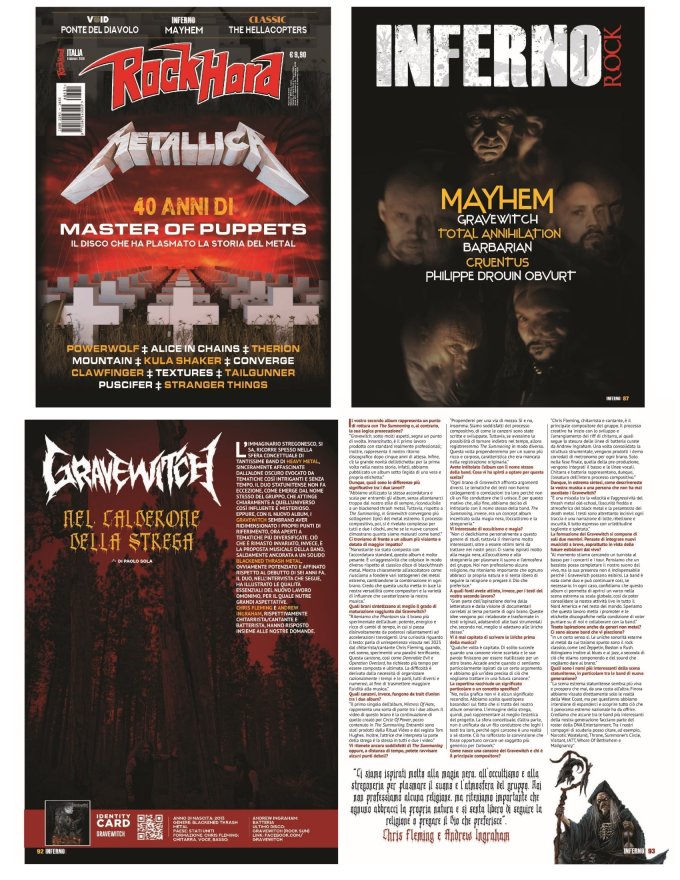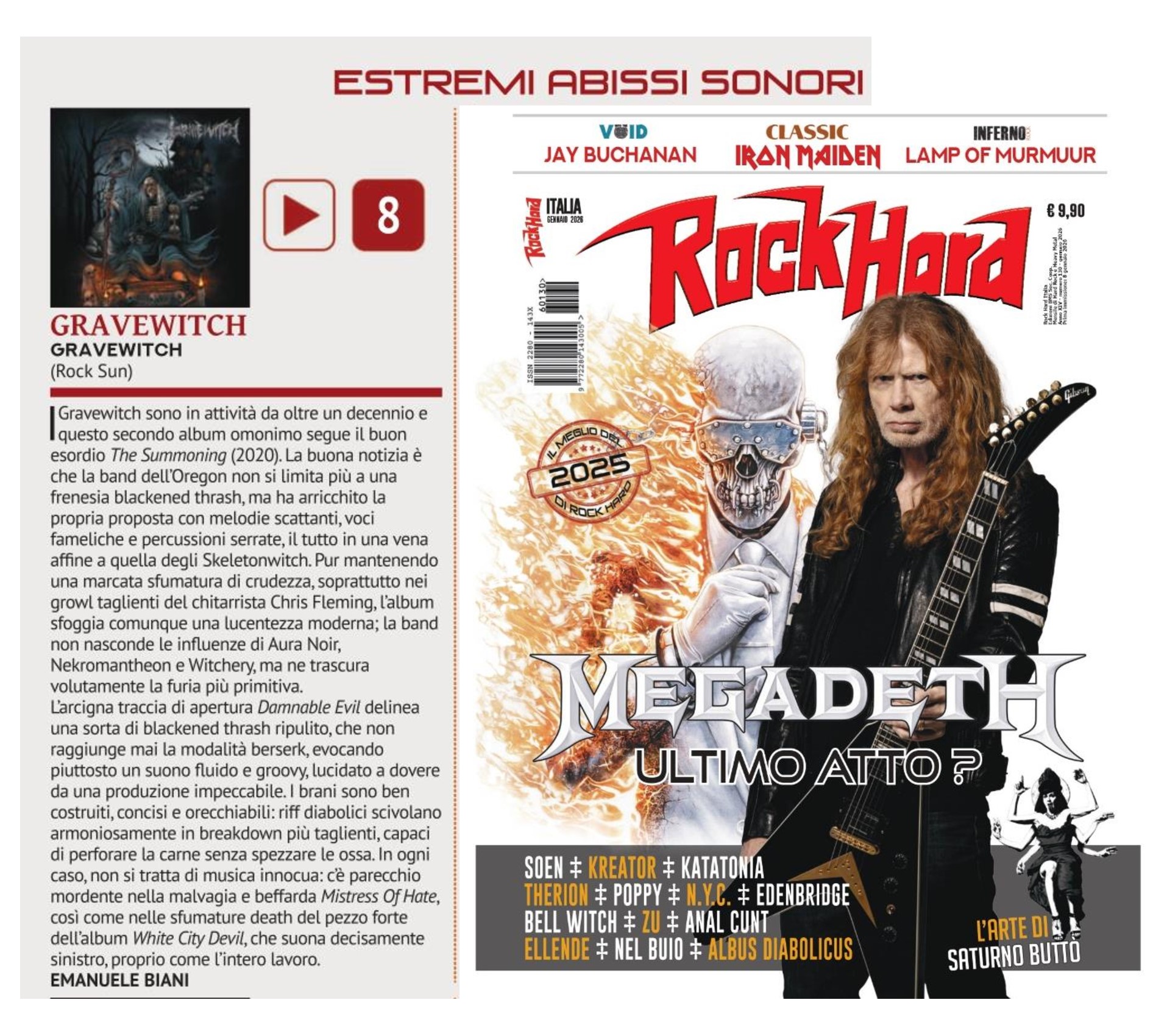 “Gravewitch have been active for over a decade, and this self-titled second album follows the strong debut The Summoning (2020). The good news is that the Oregon band no longer limits itself to a blackened thrash frenzy, but has enriched its sound with punchy melodies, voracious vocals, and tight percussion, all in a style akin to that of Skeletonwitch. While maintaining a marked raw edge, especially in guitarist Chris Fleming’s sharp growls, the album still showcases a modern sheen; the band does not hide its influences from Aura Noir, Nekromantheon, and Witchery, but deliberately eschews their more primal fury. The grim opening track Damnable Evil outlines a sort of polished blackened thrash that never reaches berserk mode, instead evoking a smooth and groovy sound, neatly sharpened by impeccable production. The songs are well-constructed, concise, and catchy: diabolical riffs slide harmoniously into sharper breakdowns, capable of piercing flesh without breaking bones. In any case, this is not harmless music: there’s plenty of bite in the wicked and mocking Mistress Of Hate, as well as in the death-tinged nuances of the album’s standout track White City Devil, which sounds decidedly sinister, just like the entire work. 8/10″ – Rock Hard Italy