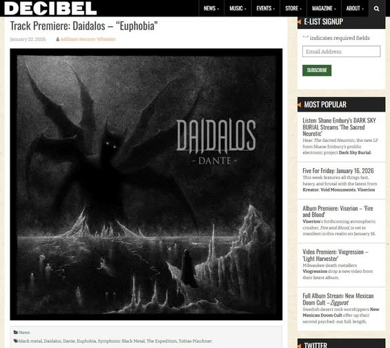 Symphonic black metal visionary Daidalos announces the premiere of their new single “Euphobia”, debuting today exclusively through Decibel Magazine. The track appears on the project’s forthcoming full‑length, “Dante,” set for release February 20th via Rockshots Records.