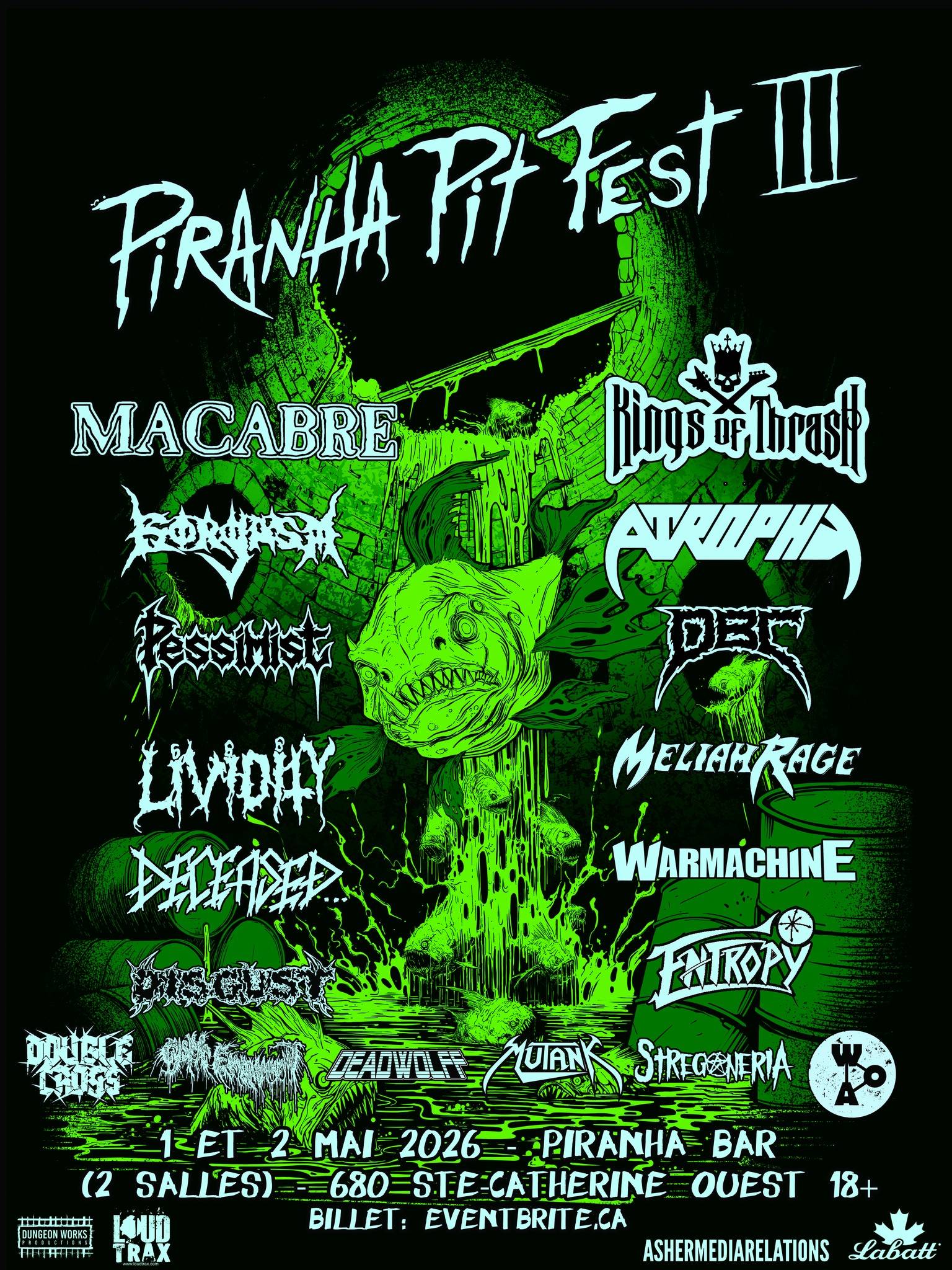 PIRANHA PIT FEST III has unleashed its 2026 lineup for two ferocious nights of death metal, thrash, and heavy metal mayhem returning to Montreal on May 1–2, 2026. Presented by Piranha Bar (680 Ste-Catherine Ouest) and Dungeonworks Productions, the festival welcomes metal fans back for one of the city’s most extreme annual events featuring MACABRE, KINGS OF THRASH, GORGASM, ATROPHY, PESSIMIST, DBC, and many more.