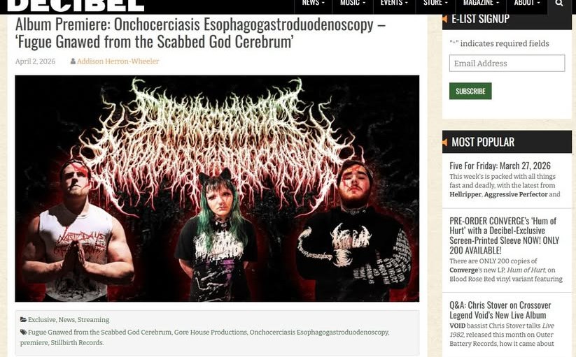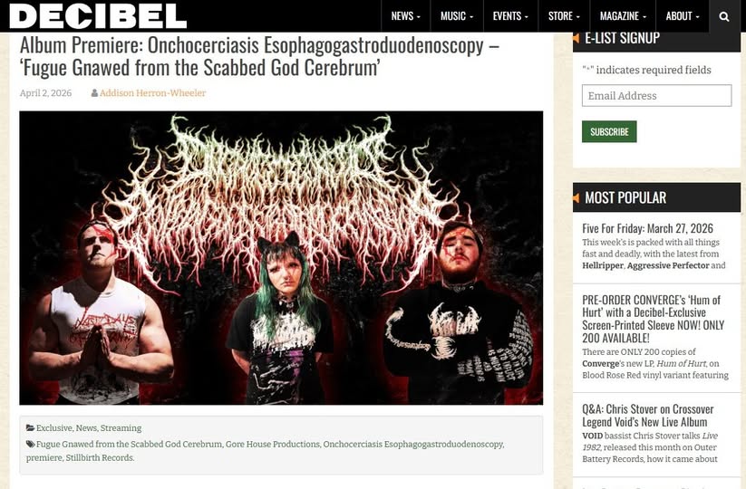 Apocalyptic brutal slamming death metal entity Onchocerciasis Esophagogastroduodenoscopy (OxE) has partnered with Decibel Magazine for the exclusive stream premiere of their long‑awaited full‑length album, “Fugue Gnawed from the Scabbed God Cerebrum,” ahead of its official release on April 3, 2026, through Stillbirth Records / Gore House Productions.