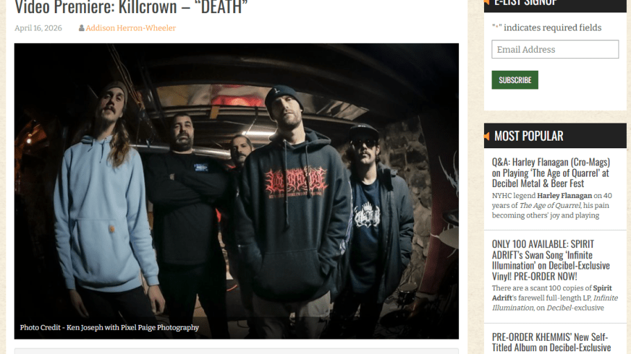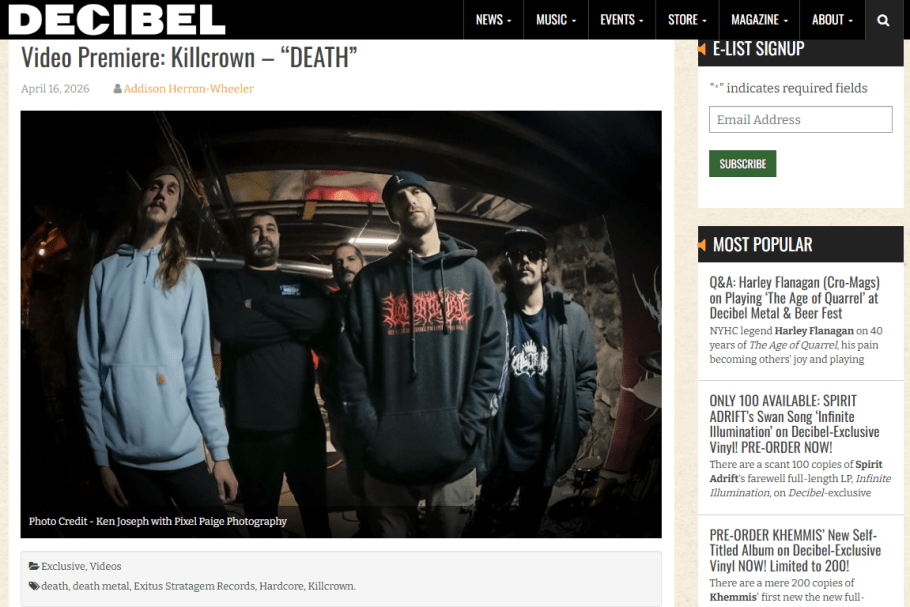 Michigan’s rising extreme‑metal juggernaut Killcrown has dropped the official music video for their debut single “DEATH”, a ferocious first strike from their upcoming, yet‑to‑be‑titled full‑length album due later this year on Exitus Stratagem Records. Shot by Pixel Page Photography inside the band’s former jam space, the video captures the raw, claustrophobic violence that defines Killcrown’s sound.