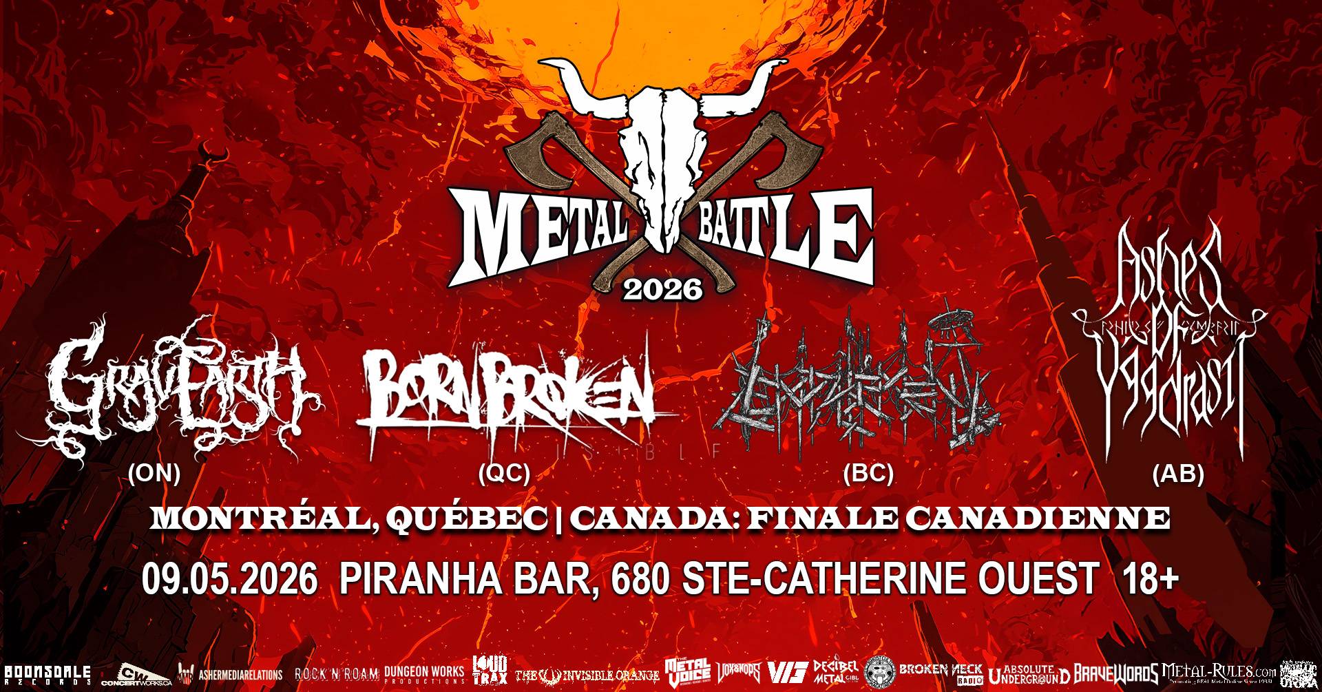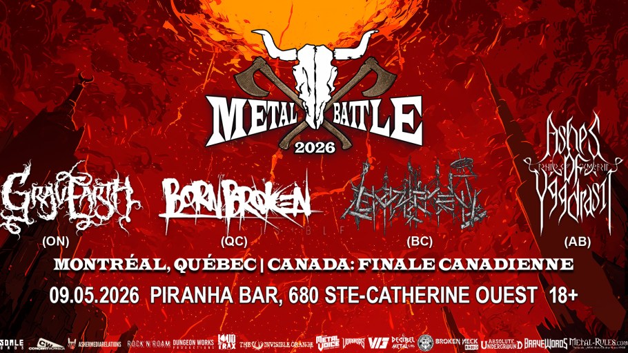 After battles hosted across the country, the final four have emerged to represent the best of the best underground metal bands in Canada and compete at the national final on May 9th in Montreal, QC, at Piranha Bar (680 Ste-Catherine Ouest), where they will perform in front of metal-hungry fans and be judged by a panel of music industry veterans that includes Luc Laine (CFLX 95.5 FM – Alerte Metallique), Pierre Beaubien (CIBL 101.5 FM – Décibel Métal), Andrew Wieler (CJLO 1690 AM – Metal Director), Kaje Jenkinson (Promoter, Freelance Metal Writer, Asher Media), Dany Soucy (Nova Spei, Bam&Co-Heavy Label and Trois-Rivieres Metalfest), Patrick Loisel (Augury), and JJ Tartaglia (Wacken Metal Battle Canada, Thunderor, Skull Fist).