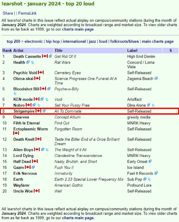 0 \m/ Thank You For The Airplay Love Canadian MDs and DJs \m/ !earshot – January 2024 – Top 20 Loud #8 Strigampire