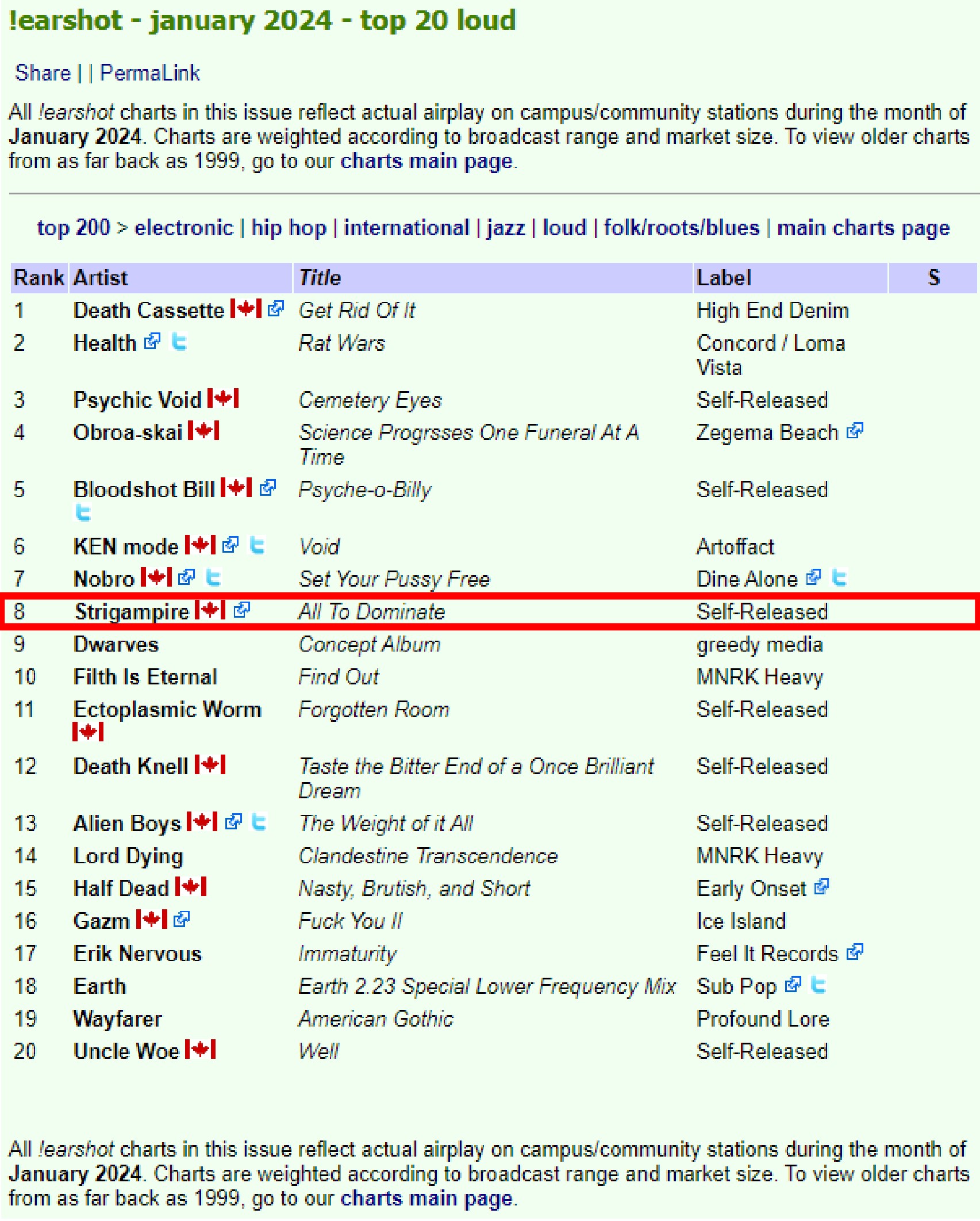 0 \m/ Thank You For The Airplay Love Canadian MDs and DJs \m/ !earshot – January 2024 – Top 20 Loud #8 Strigampire