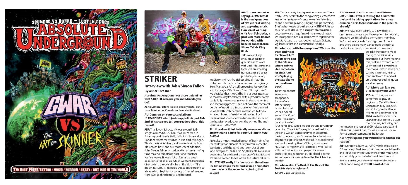 Striker is kicking off 2024 with their seventh studio album “ULTRAPOWER”, which follows their Juno Award-winning self-released full-length “Play to Win” (2018) released on their label Record Breaking Records. The new album also features the band’s latest lineup addition of long-time friend and guitarist John Simon Fallon (The Order of Chaos). For the band’s seventh full-length, they teamed up with producer Josh Schroeder (Lorna Shore, Tallah, King 810), entering the studio in March 2023. With the band writing material since 2018, “ULTRAPOWER” is a collection of five years of Striker tinkering and exploring new avenues.