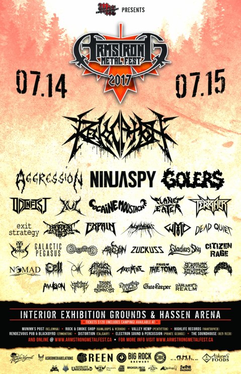 Situated in the Okanagan Valley with the beautiful backdrop of the Rocky Mountains, ARMSTRONG METALFEST, now in its ninth year, is British Columbia’s largest gathering of metalheads from across Western Canada and beyond. This year’s 2017 line up being held on July 14th and 15th at the Hassen Arena in Armstrong, BC with headliners include Boston’s tech death / thrash titans REVOCATION, Vancouver’s reggae-metal fusion NINJASPY, Canadian 80’s thrash legends AGGRESSION and Vancouver Whammy Award Best Local Metal Artist winner GOLERS among many more from across the country. (Full list of bands and set times below.)