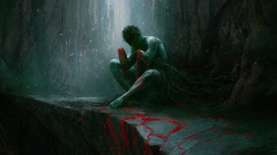 – All our artworks are painted. A being is sitting, hands cut off, and blood running down the arms to the ground. The being is swallowed by the earth. The colour concept is moody cool tone pastels, dark blues and greens which match our first album colour scheme and a contrast of red.