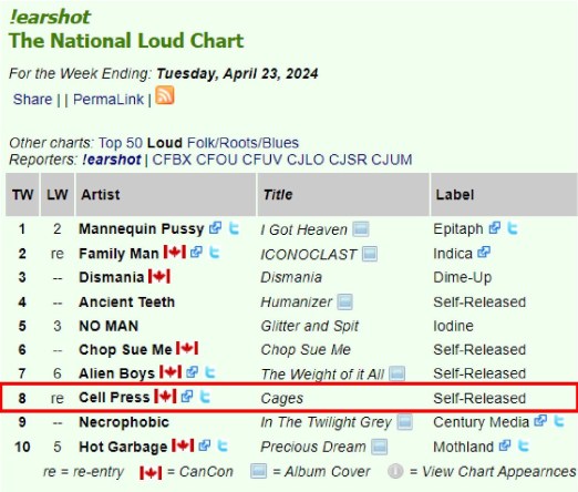 0 Thank You Canadian MDs and DJs for the airplay love \m/\m/ #10 Cell Press – !earshot – The National Loud Chart For the Week Ending: Tuesday, April 9, 2024