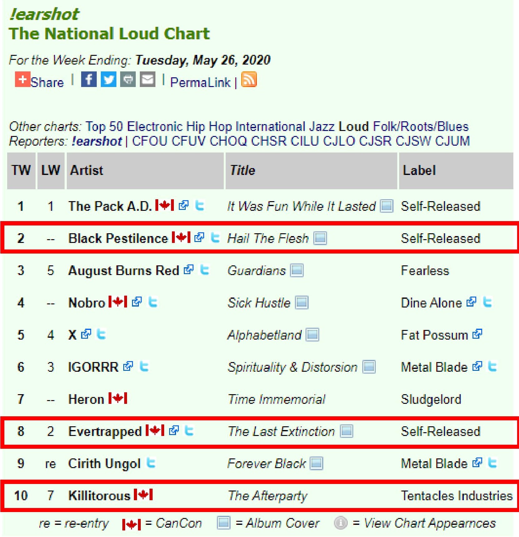 0 Thank You MDs and DJs for your airplay love! \m/\m/ !earshot – The National Loud Chart For the Week Ending: Tuesday, May 26, 2020 #2 Black Pestilence – Hail The Flesh – Self-Released #8 [EVERTRAPPED] – The Last Extinction – Self-Released #10 Killitorous – The Afterparty – Tentacles Industries