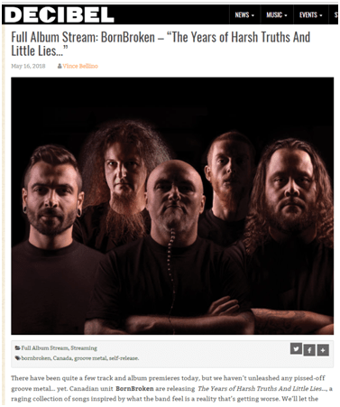 “The Years of Harsh Truths and Little Lies est un autre chef-œuvre musical que BornBroken nous as pondu. Cinq années d’attente, mais croyez-moi, l’attente en vallait la peine. La voix de Pepe Poliquin est à son meilleur et ultra efficace. Un duo du guitariste hors pair qui nous offre toutes sortes d’émotions qui passent par la brutalité de la mélodie et de plusieurs autres nuances. Une batterie qui nous offre un rythme essoufflant et sans concessions. Une basse très présente et qui se ressent à plusieurs endroits sur l’album. Dix chansons fortement bien exécutées et bien composées. Une production en béton armé, et un son d’enfer. Une production signée Chris Donaldson (Cryptopsy) et Marco Frechette. Le tout enregistré au studio The Grid à Montréal. The Years of Harsh Truths and Little Lies est définitivement l’album qui va projeter BornBroken à un autre niveau sur l’échiquier du métal mondial. ” – Quebec Metal