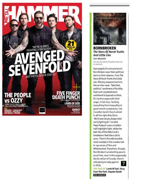 0 Metal Hammer – BornBroken – The Years of Harsh Truths And Little Lies… “Apocalyptic thrashcore bunch BornBroken wear their political bent on their sleeves. From ‘The Years of Hard Truths And Little Lies’ Bansky-esque artwork to on-the-nose, ‘Take that politics!’ sentiment of its title, their anti-establishment sentiment is layered on thick. It’s hard to argue with their anger, in fairness. Tackling everything from inequality to government conspiracies, the Canadian band’s fury is aimed in all the right directions….BornBroken’s unrelenting pace is proof that, even in the supposedly docile nation of Canada, there’s still plenty to rally against in 2018.”