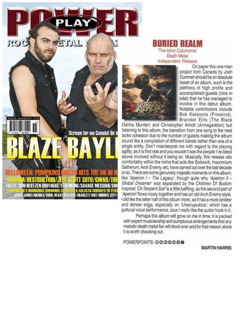 ”Buried Realm’s debut album The Ichor Carcinoma, which sees the next chapter in the soul key band member Josh Dummer’s, emotionally charged dark twisted vision come to life in the form of a hard hitting, electrifyingly intense experience for fans of Heavy Metal to experience and enjoy.” – Noizze UK (Review – The Ichor Carcinoma 2017)