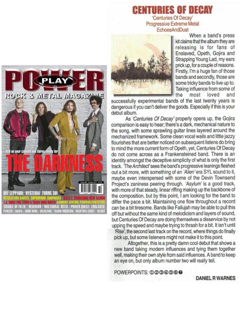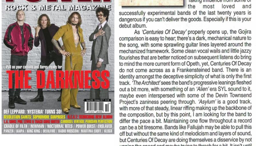 “This is not a one-dimensional album that’s easily described. Each song has its own style and flavour, mixing different styles together with well-deserved contempt for genre restrictions and constraints. Centuries of Decay have crafted a modern extreme metal release that effectively combines these different strains of metal into something all of their own.” – Wonderbox Metal