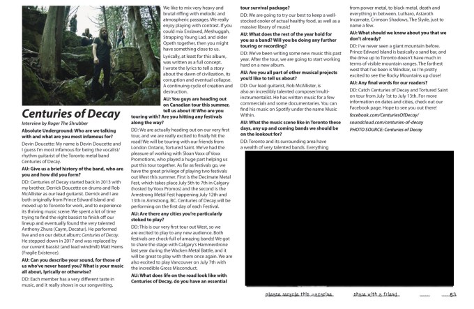 “Centuries of Decay are thrilled to be embarking on our very first cross-Canada tour with Tortured Saint. Not only do we get to play Decimate and Armstrong Metal Fest, but we get to share the stage with some incredible bands like Gross Misconduct and our old friends Hammerdrone. We’ve been hard at work on some exciting new music and will be adding a new song or two to our set list. We can’t wait to finally meet the West Coast Metal scene.”