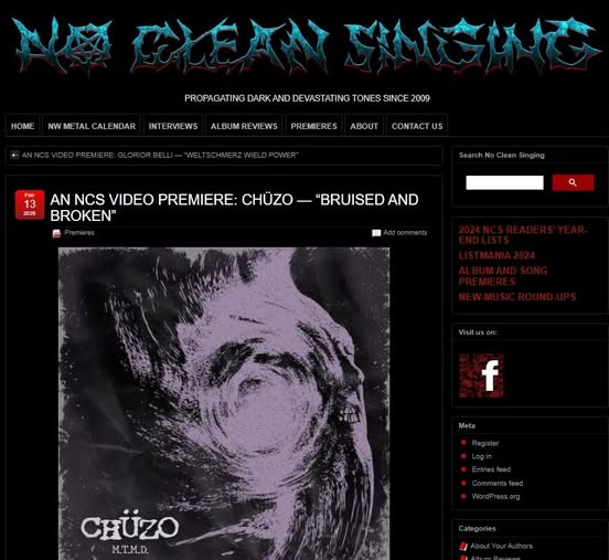 ““Bruised and Broken” is definitely a rager. Mischa and Christian belt out the words in a tandem of furious screams and monstrous roars. Behind them, the song discharges high-speed percussive obliteration and punk beats, a violent churn of high-grit riffage, and bowel-loosening bass-quakes. The band also work in mean-eyed slashing chugs, a brutalizing breakdown that seems to get more thuggish but no less head-hooking as the seconds pass, an explosion of boiling and battering grindcore mayhem, and another hardcore beatdown that’s probably a sure-fire mosh trigger in a live show — with Mischa‘s screaming voice still coming for your throat with no-holds-barred intensity. Just this one song proves that for Chüzo the label “Aggro Metal” isn’t false advertising. It’s a gut-slugging, bone-smashing, vocally blistering, and viciously eviscerating outburst, and it also proves to be a pretty addictive piece of rage-fueled catharsis too. Speaking of live shows, the video gives a good sense of what the band’s live sets are about, and a good sense of how much fun they had beating the shit out of things in that rage cage.” – No Clean Singing