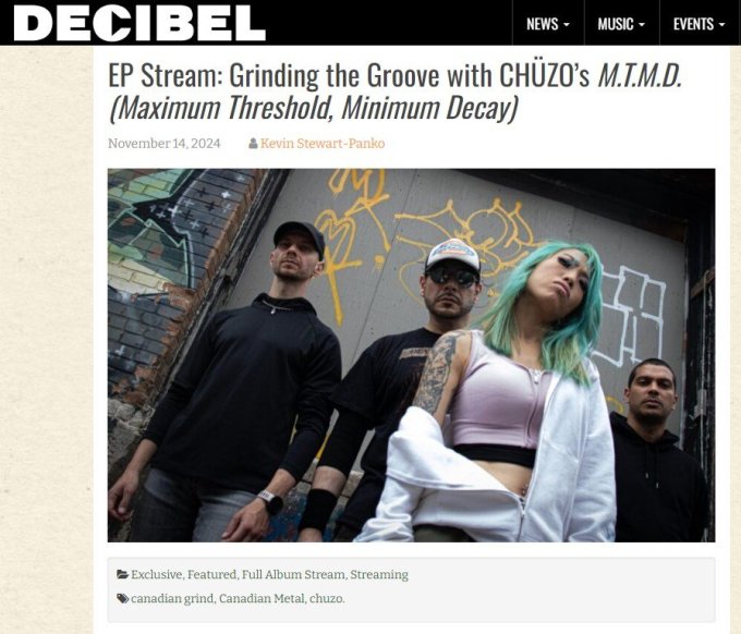 “‘A Brazilian vocalist, a Chilean guitarist, a Russian bassist and a Venezuelan drummer walk into a Montreal metal bar’ might sound like the beginning of a borderline funny joke, but it, in a roundabout way, speaks to the christening of thrash, punk, death-beat quartet CHÜZO. The band’s latest EP — M.T.M.D.(Maximum Threshold, Minimum Decay) — is the latest in a long line of releases since forming in 2020 and sees the light of day today. The band has a lot to say about their latest endeavour, but fans of old Sepultura, Napalm Death, At the Gates and Fuck the Facts should find something of interest ” – Decibel Magazine